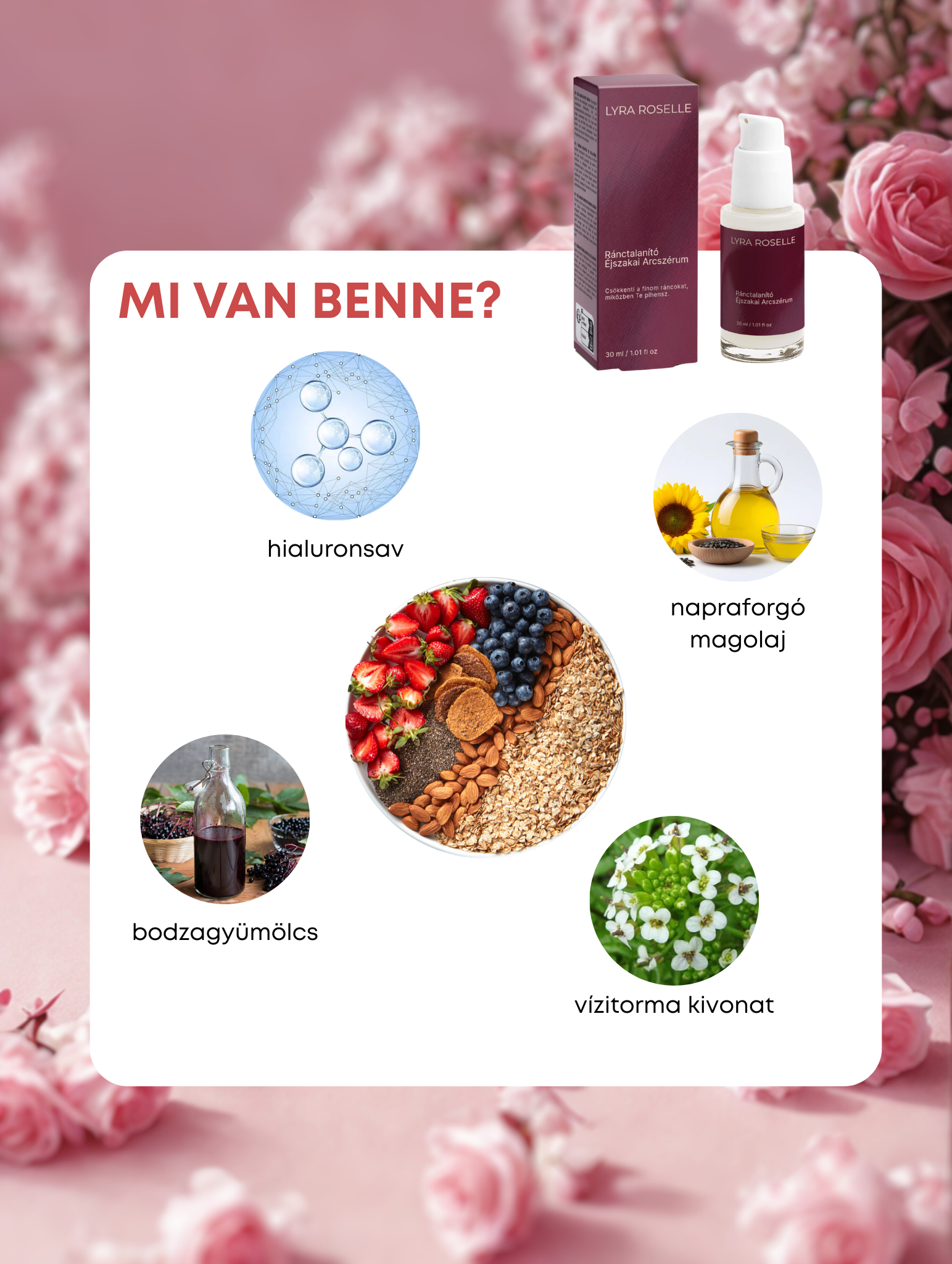 Ránctalanító éjszakai arcszérum hialuronnal, napraforgó-olajjal, és bodzagyümölcs kivonattal – simább, teltebb bőrre ébredsz.